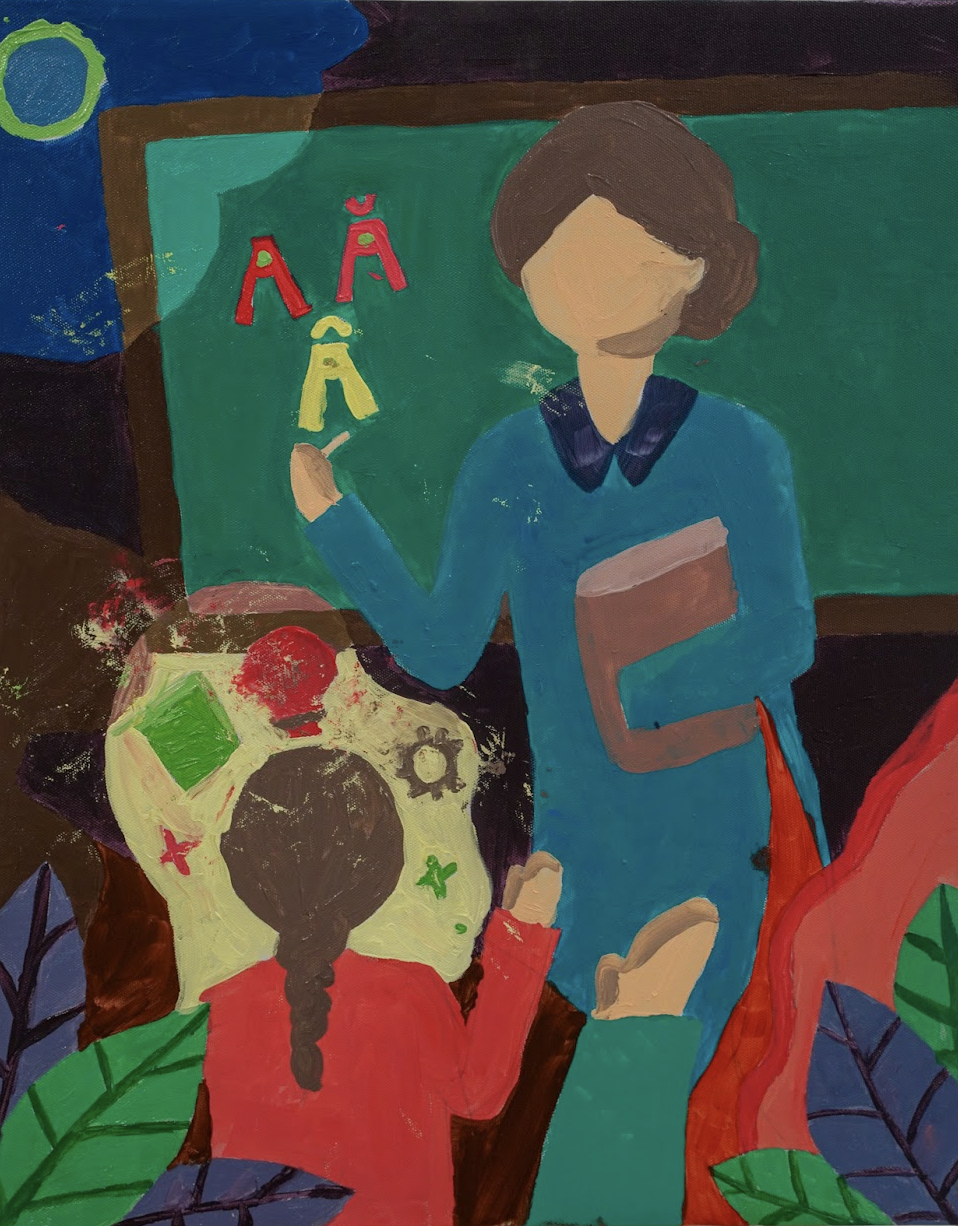 Trong không gian lớp học giản dị, hình ảnh cô giáo đang giảng bài trước học sinh gợi nhắc về những ký ức tuổi thơ trong trẻo. Những gam màu tươi sáng và đường nét mộc mạc thể hiện sự hồn nhiên của tuổi học trò và giá trị của tri thức.