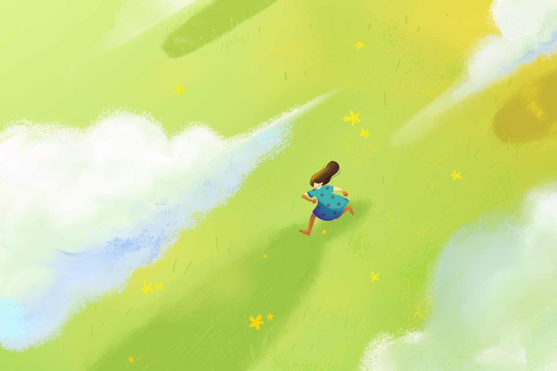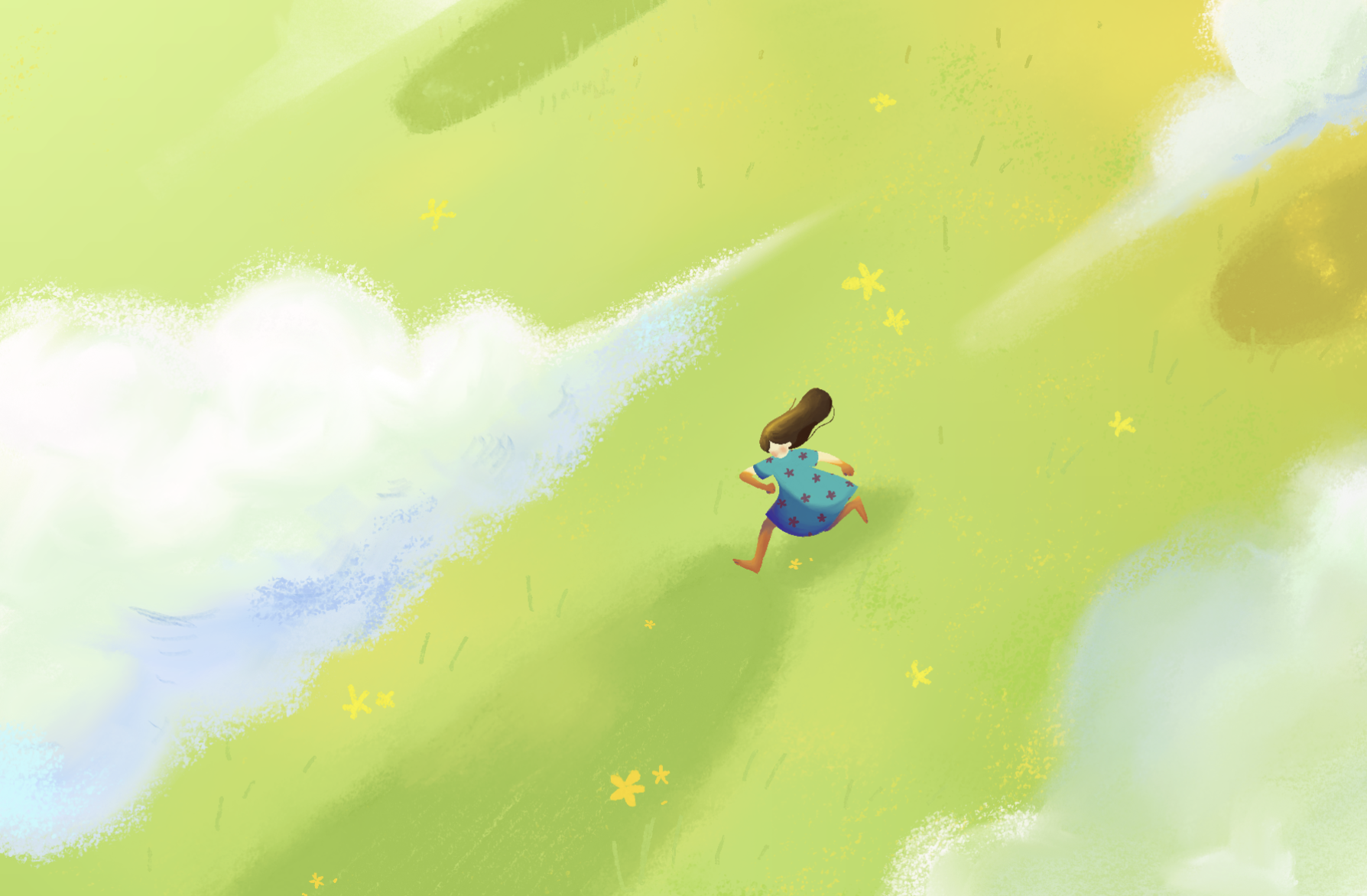 Khắc họa hình ảnh một cô gái nhỏ đang chạy qua đồng cỏ xanh, giữa bầu trời trong và những cụm mây nhẹ. Gam màu tươi sáng mang lại cảm giác tự do, bình yên và hy vọng — như một hành trình tìm về những khoảng trời riêng của tuổi trẻ.