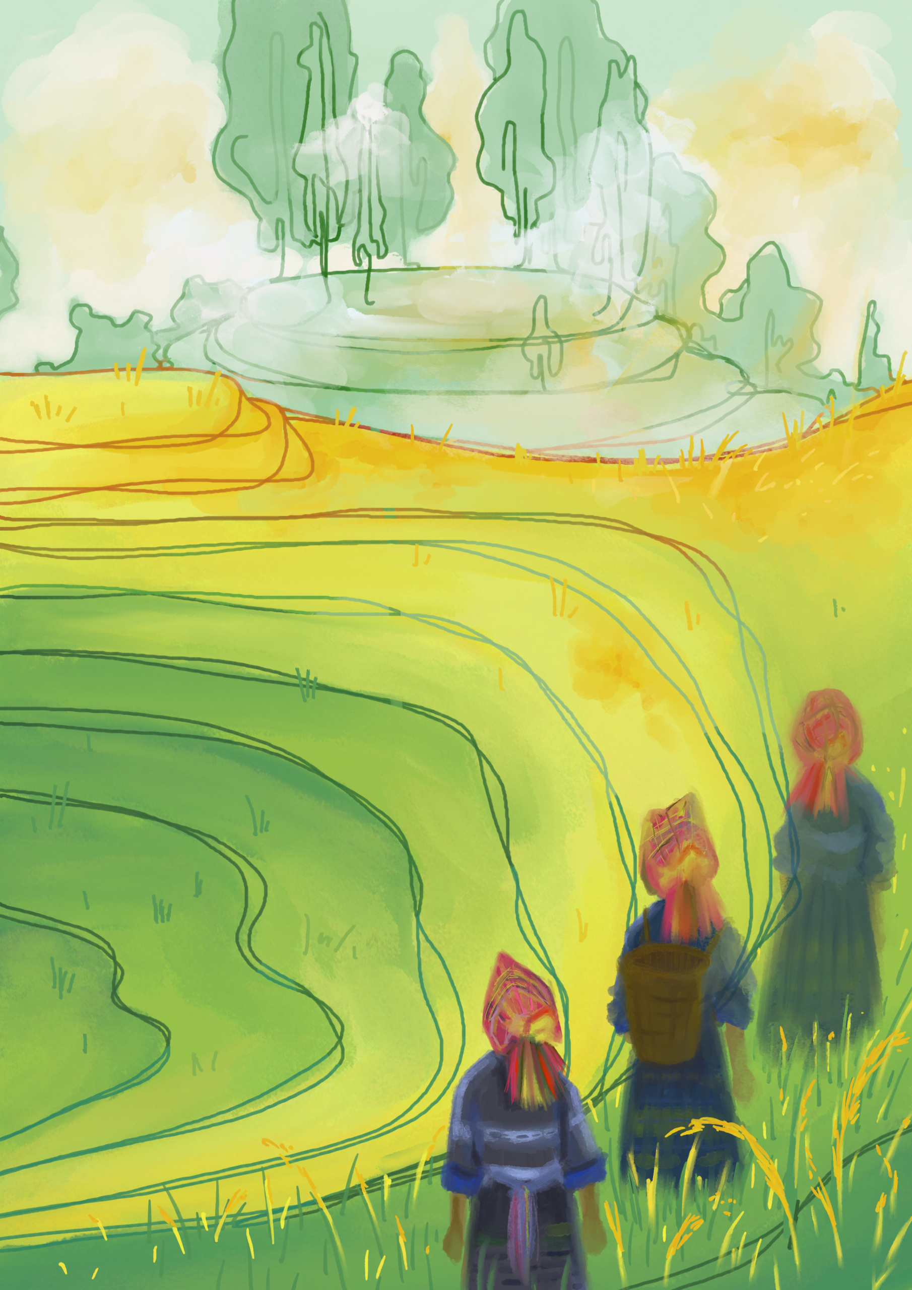 Bức tranh tái hiện khung cảnh những cô gái vùng cao bước qua ruộng bậc thang trong ánh nắng nhẹ. Màu xanh của núi rừng hòa cùng ánh sáng vàng tạo nên cảm giác yên bình, giản dị và đầy sức sống của bản làng miền núi.