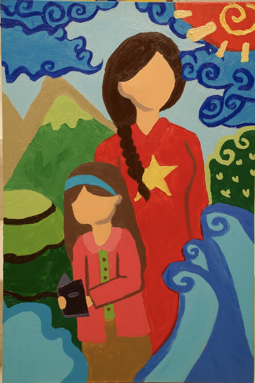 Tà áo dài đỏ với ngôi sao vàng nổi bật giữa khung cảnh thiên nhiên tượng trưng cho niềm tự hào và tình yêu quê hương đất nước. Hình ảnh người phụ nữ và em nhỏ đứng cạnh nhau gợi lên sự tiếp nối giữa các thế hệ, nơi giá trị truyền thống được gìn giữ và lan tỏa.